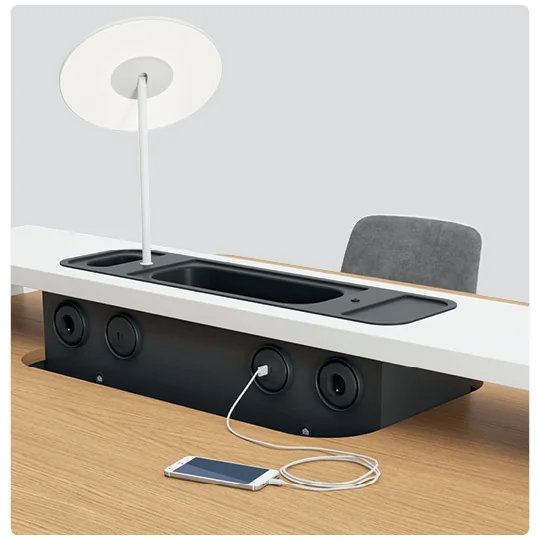 integrierte Stromanschlüsse erleichtern die Organisation der täglichen Arbeit an vielen Geräten