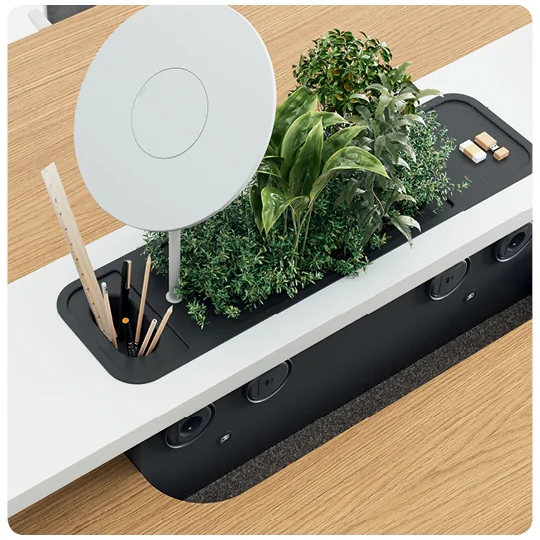 HushSpot ist ein moderner Hot Desking Tisch, ein vollständig ausgestatteter Arbeitsbereich für alle Mitarbeiter, die keinen festen Arbeitsplatz im Büro haben. Es handelt sich um eine Lösung für Unternehmen, in denen hybrides Arbeiten inzwischen alltäglich ist. HushSpot verfügt über die erforderlichen Module für effektives Arbeiten, wie z. B. Stromanschlüsse, Ablagen für Bürozubehör, Platz für Pflanzen, ein Fach für die Aufbewahrung von Bürozubehör wie auch zusätzliche LED Beleuchtung.